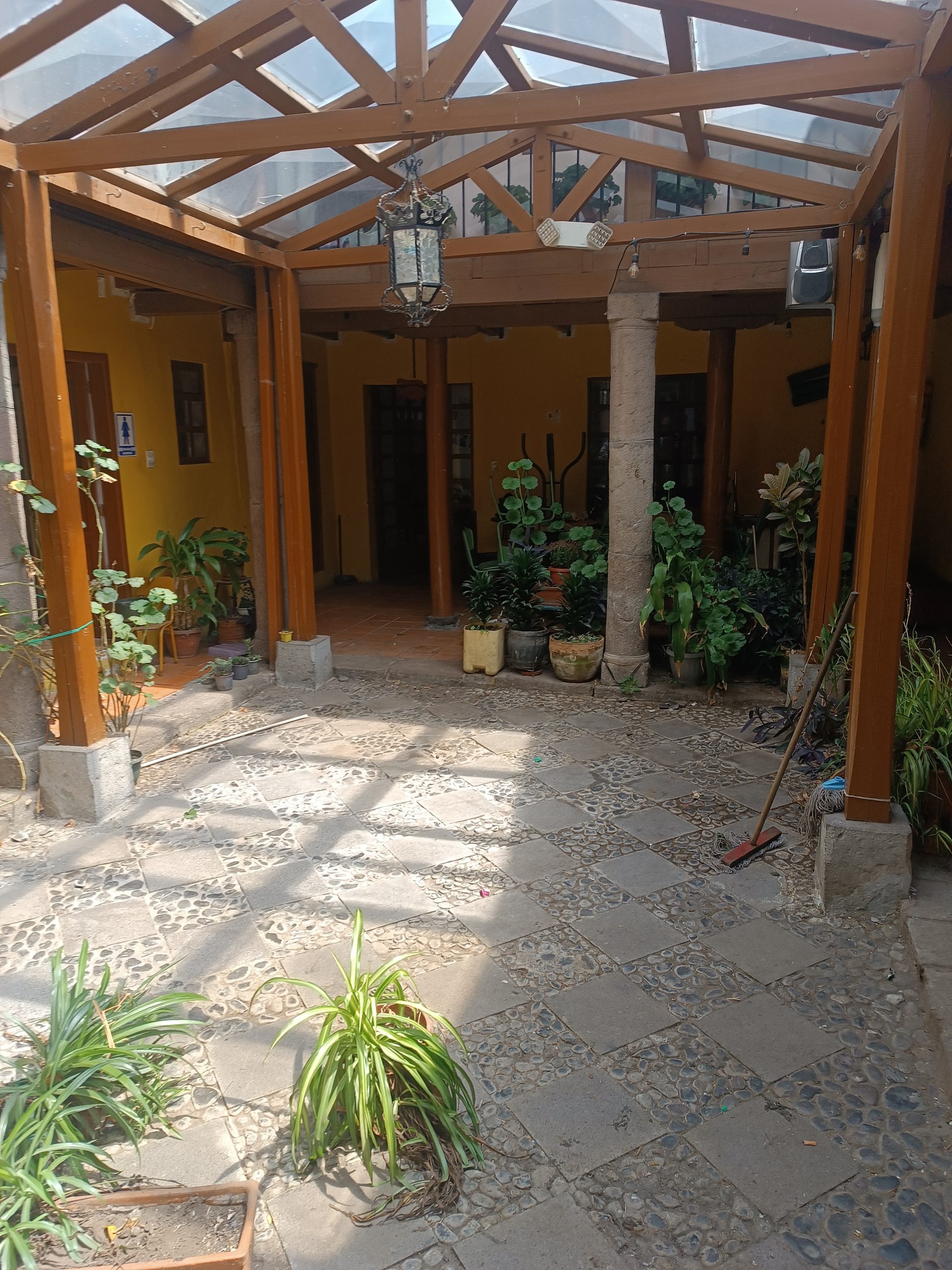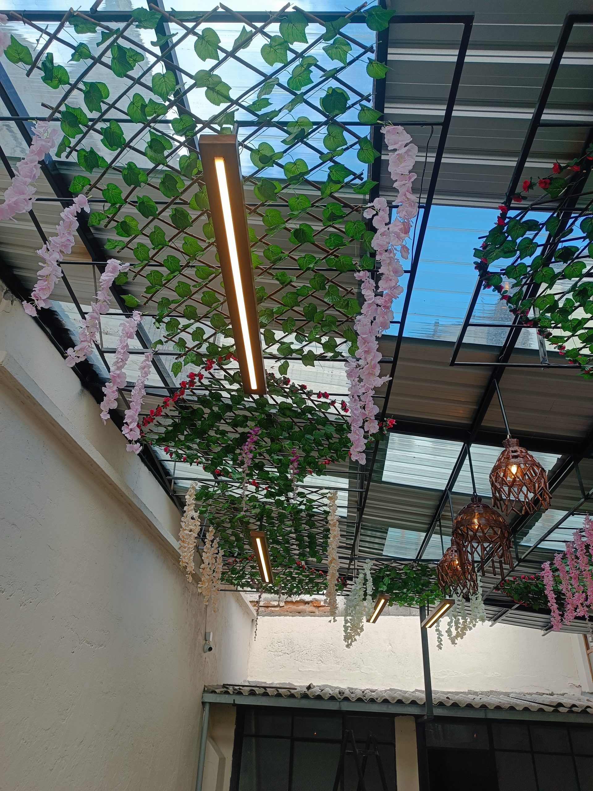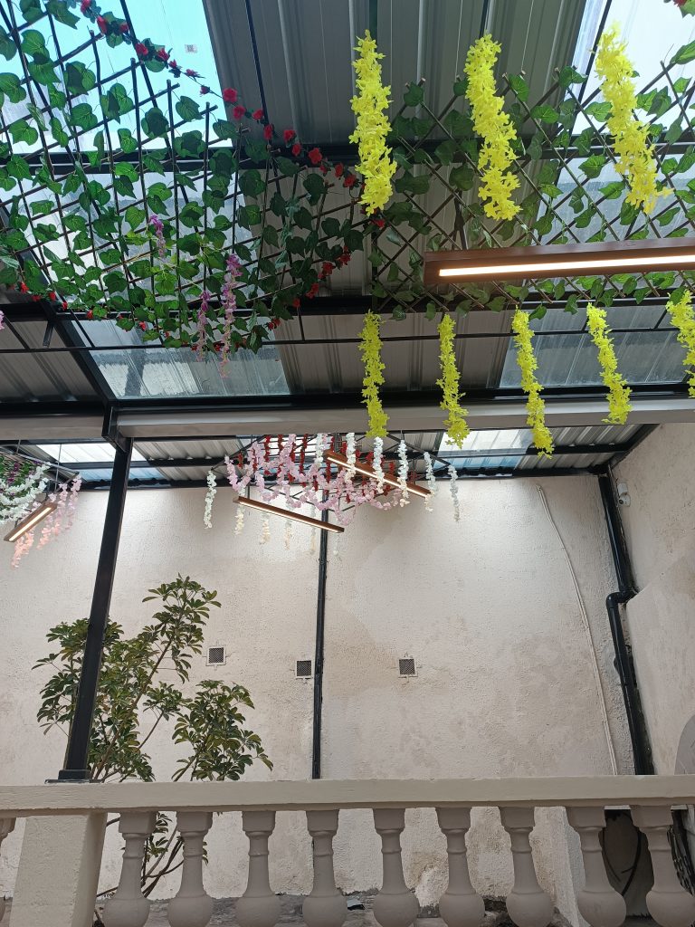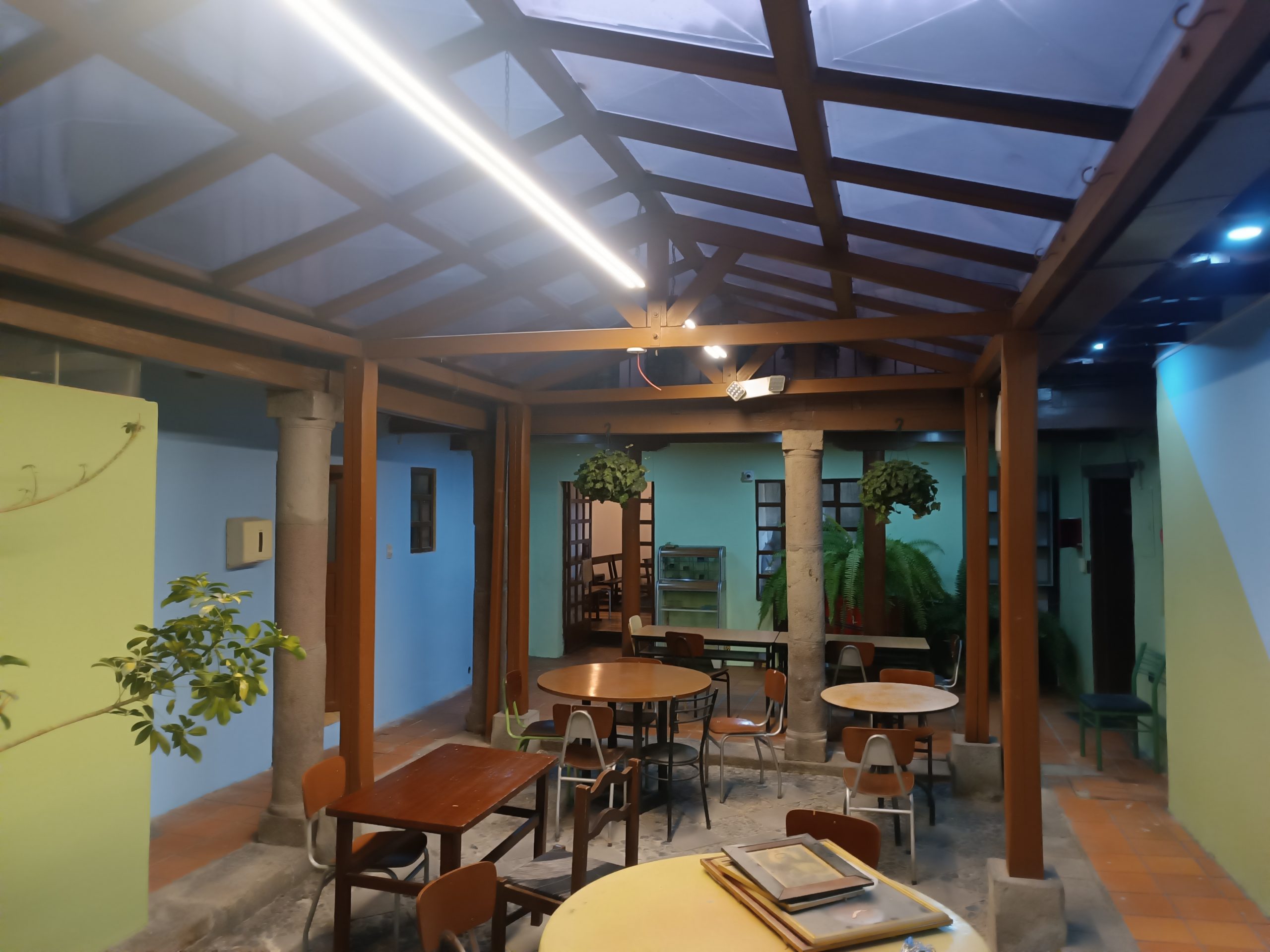 Habilitación de patios interiores, integrando iluminación ambiental y decoración con plantas artificiales, creando un entorno cálido y acogedor.